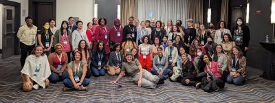 Photo captured at the conclusion of the Question and Answer session of the reception. Alt text: R-Ladies community members gathered in a room of the Hyatt in Chicago, with rows of individuals standing, kneeling, and sitting.